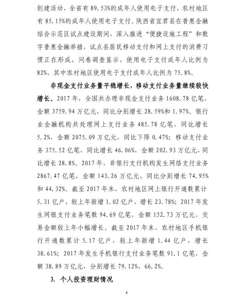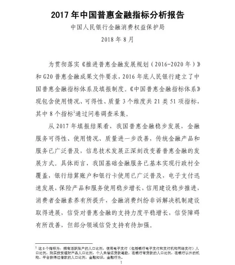 导读:今日,中国人民银行金融消费权益保护局发布了《2017 年中国普惠金融指标分析报告》。报告从普惠金融的重点指标、可得性维度、质量维度三个方面做了详细分析。