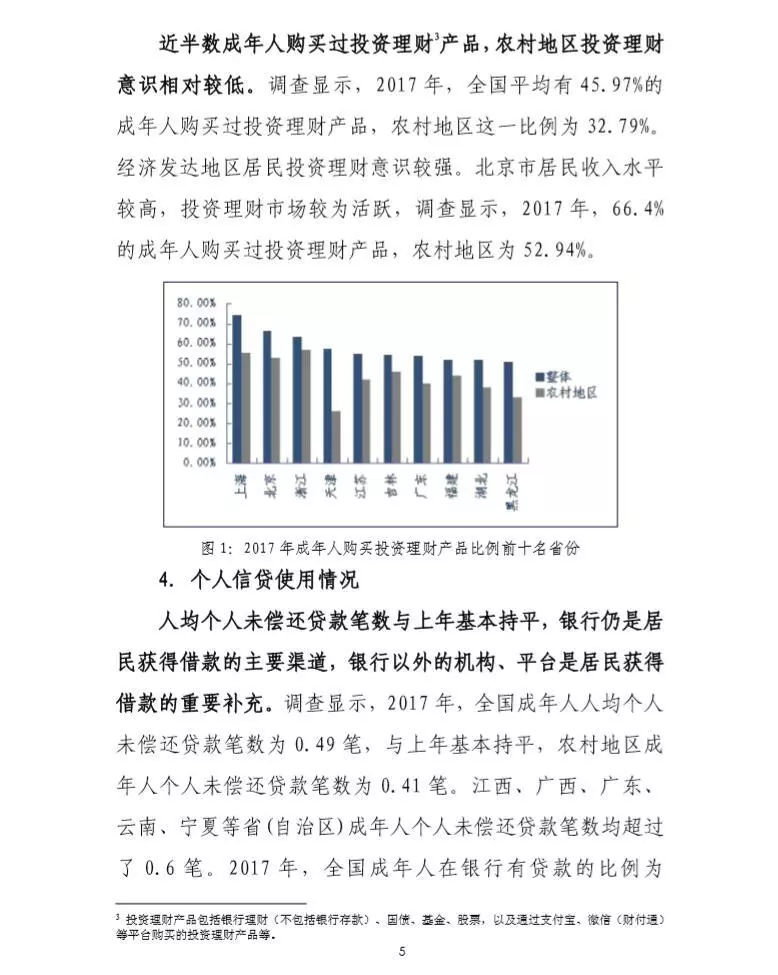 根据调查显示,2017 年,全国成年人人均个人未偿还贷款笔数为 0.49 笔,与上年基本持平,农村地区成年人个人未偿还贷款笔数为 0.41 笔。