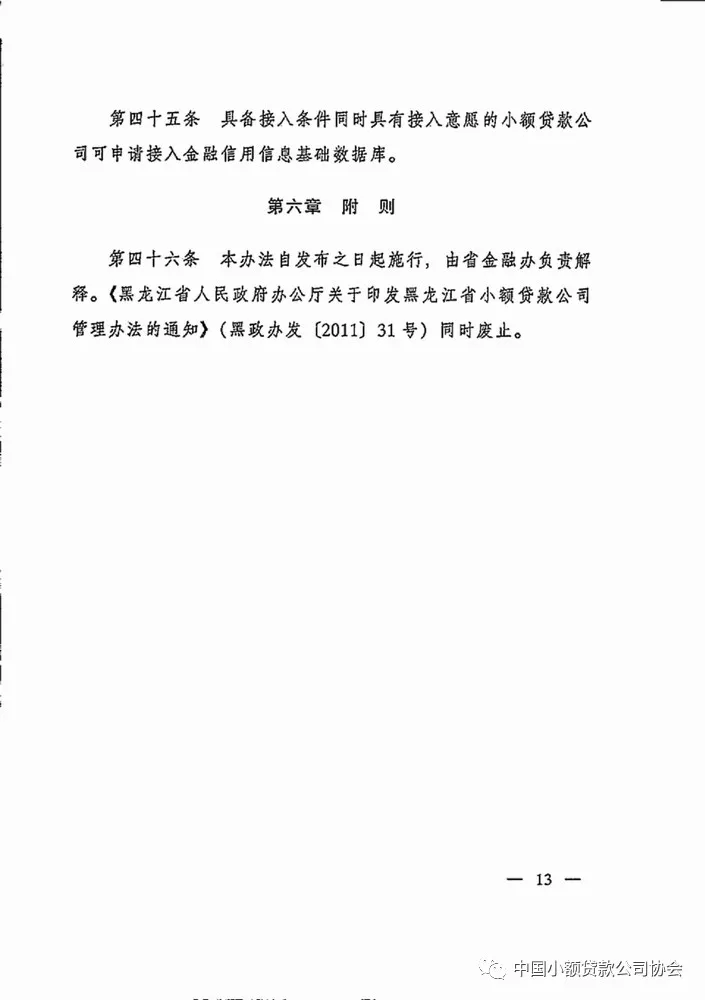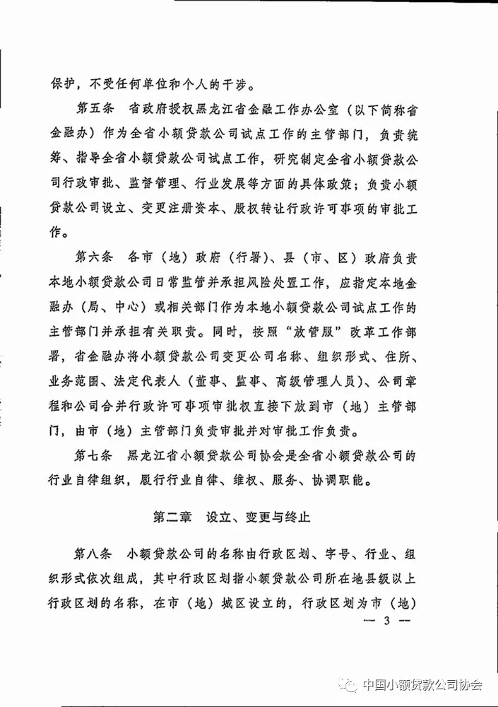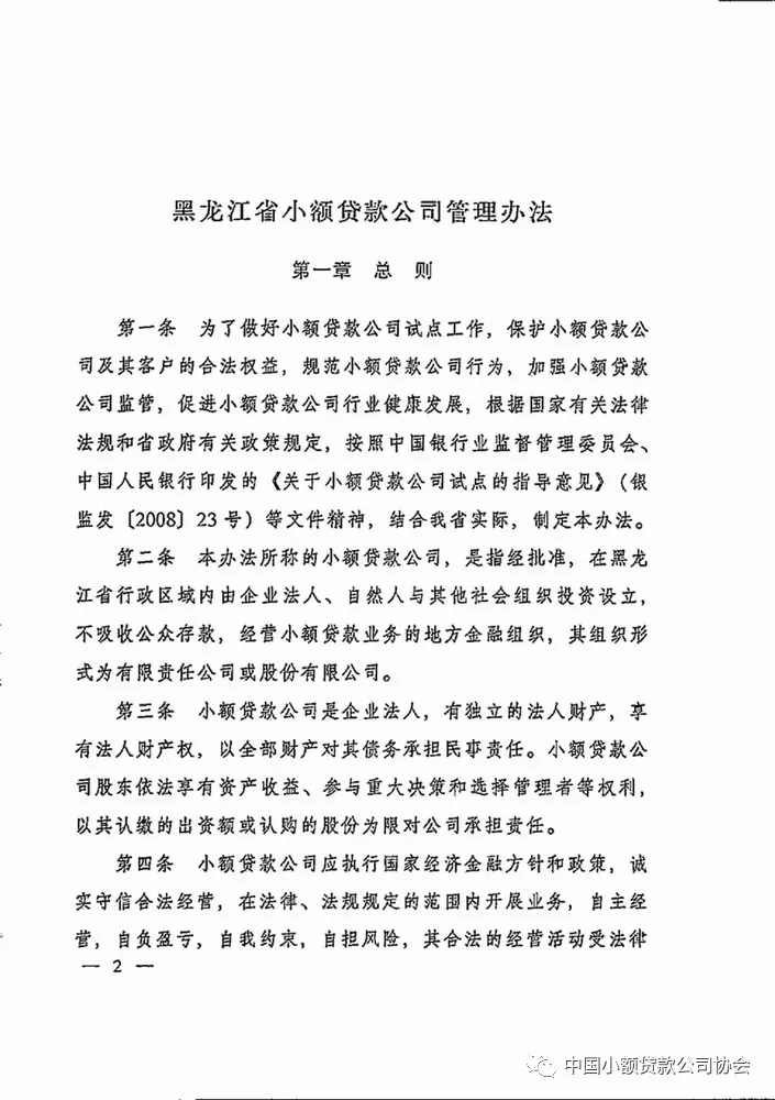 为保护小额贷款公司及其客户的合法权益,促进小额贷款公司行业健康发展,《黑龙江省小额贷款公司管理办法》日前印发并施行。根据《办法》,小额贷款公司应执行国家经济金融方针和政策,诚实守信合法经营,在法律、法规规定的范围内开展业务,自主经营,自负盈亏,自我约束,自担风险,其合法的经营活动受法律保护,不受任何单位和个人干涉。