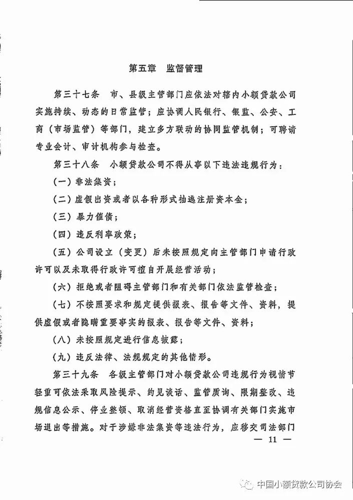 小额贷款公司不得从事非法集资、虚假出资或者以各种形式抽逃注册资本金、暴力催债、违反利率政策等违法违规行为。各级主管部门对小额贷款公司违规行为视情节轻重可依法采取风险提示、约见谈话、监管质询、限期整改、违规信息公示、停业整顿、取消经营资格直至协调有关部门实施市场退出等措施。对于涉嫌非法集资等违法行为,应移交司法部门处理。对没有取得行政许可擅自开展经营活动的小额贷款公司,市、县级主管部门应会同有关部门依法给予严肃查处。