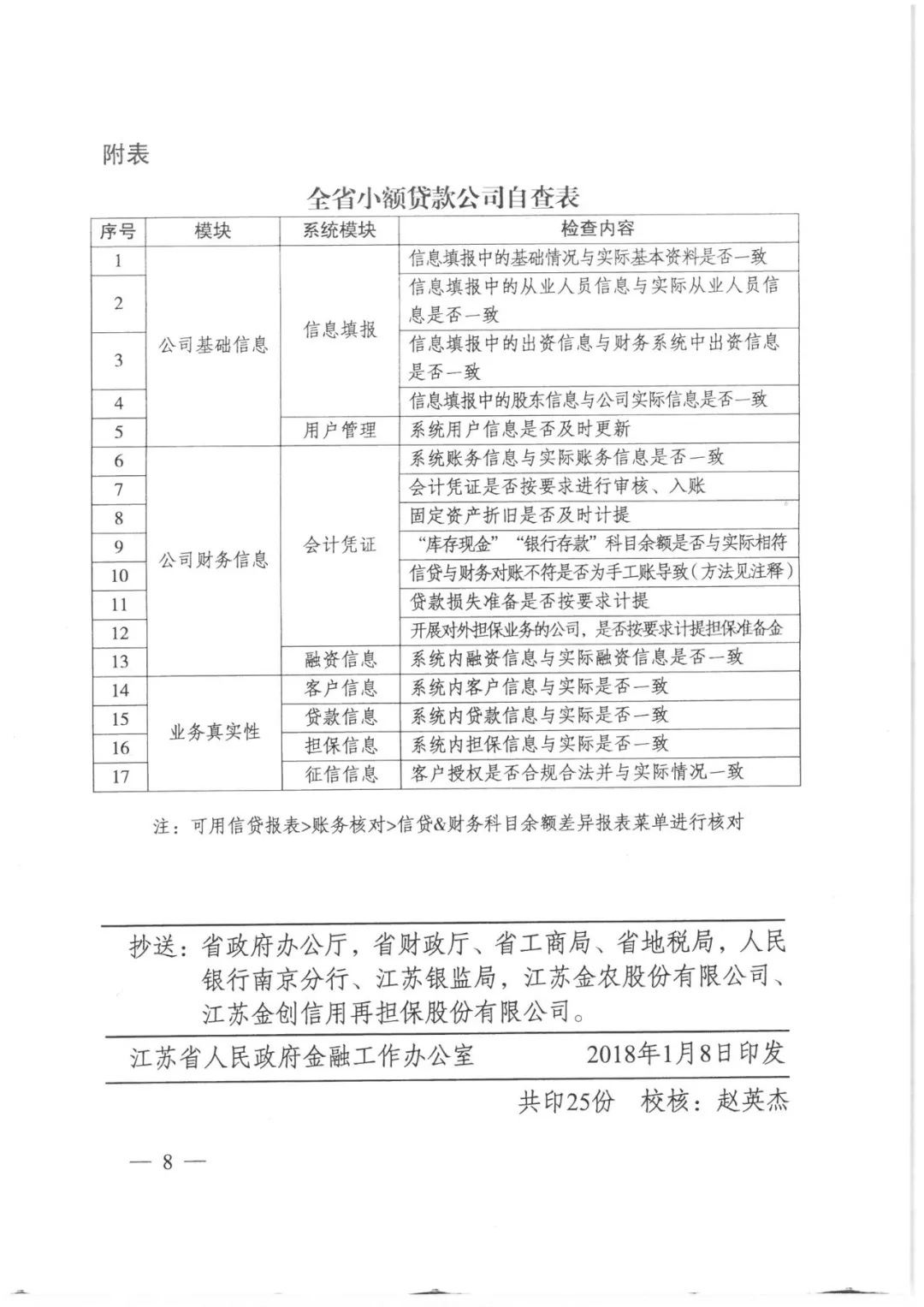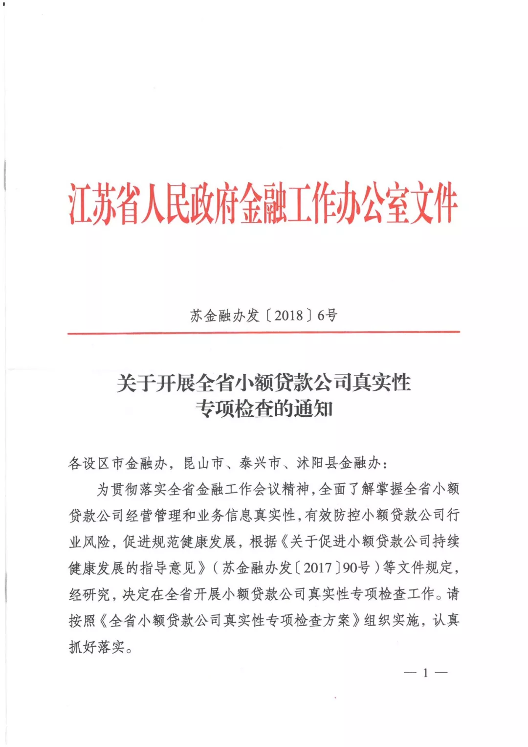 为贯彻落实江苏省金融工作会议精神,全面了解掌握全省小贷公司经营管理和业务信息真实性,有效防控行业风险,促进行业规范健康发展,江苏省金融办近日发文,将在全省范围内开展小额贷款公司真实性专项检查工作。